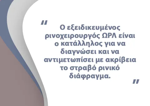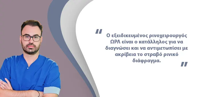 Καθοριστικής σημασίας για την ασφάλεια του ασθενή και την επιτυχή αντιμετώπιση του στραβού ρινικού διαφράγματος είναι η επιλογή του κατάλληλου Ρινοχειρουργού ΩΡΛ. Αυτός μπορεί να διαγνώσει με ακρίβεια τα προβλήματα στην ανατομία της ρινός και να προσφέρει στον ασθενή μία άριστη αναπνοή. Μάλιστα αν επιλεγεί να πραγματοποιηθούν ταυτόχρονα διάφραγμα και ρινοπλαστική, το άτομο απλαμβάνει επιπλέον μία ανανεωμένη εμφάνιση.